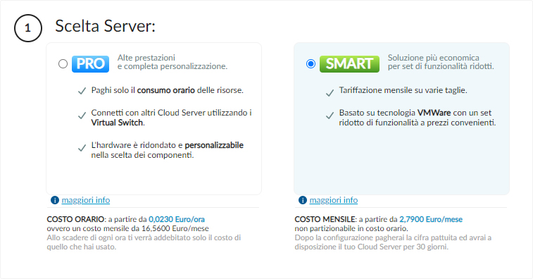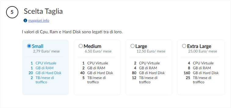 Taglia" che si vuole assegnare al Cloud Server Smart. Le risorse (vCPU/RAM/HD/Traffico dati) del servizio Cloud Server Smart sono impostate a taglie, è possibile scegliere tra quattro diverse configurazioni disponibili.