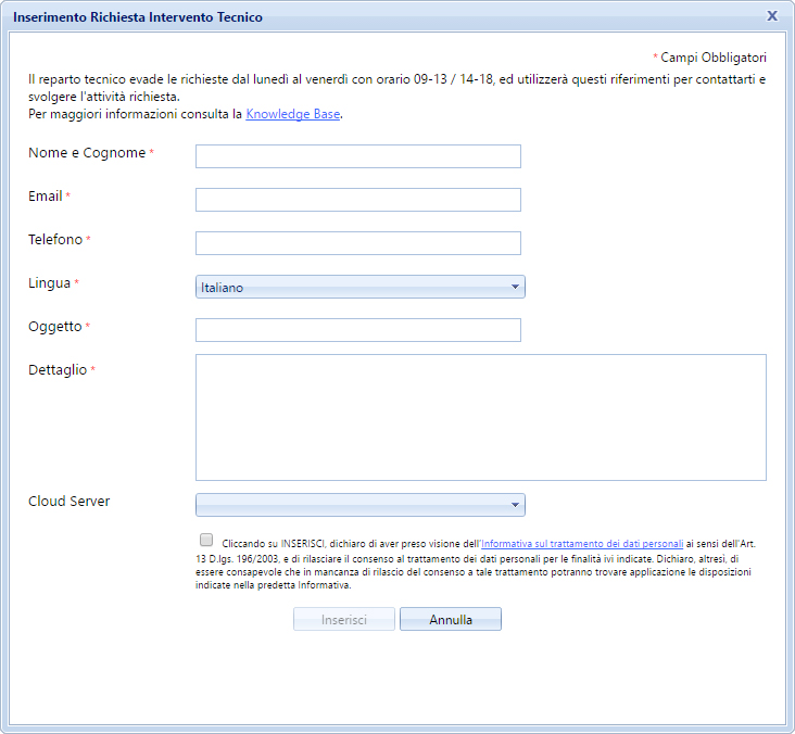 Cloud Server" è possibile selezionare il Cloud Server per il quale si richiede l'intervento. I campi dei recapiti sono obbligatori poiché alcune comunicazioni potrebbero prevedere un contatto da parte del reparto tecnico direttamente all'utente, si ricorda quindi di