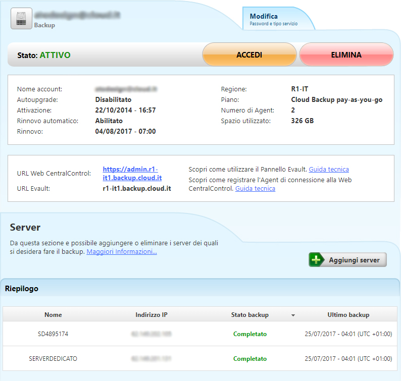 - Sospeso - in questo stato l'Account Backup mantiene le proprie caratteristiche (piano tariffario e configurazioni impostate) ma non è utilizzabile. Questo stato può essere configurato manualmente dall'utente o può essere impostato dal sistema a seguito dell'esaurimento del credito disponibile.