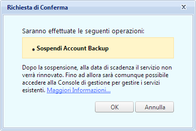 Per procedere alla modifica dello stato (ATTIVO/SOSPESO) di un Account Backup è necessario cliccare su i rispettivi pulsanti.