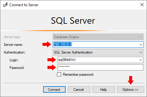 Server={IpAddress};Database={databaseName};User Id={username};Password={password};